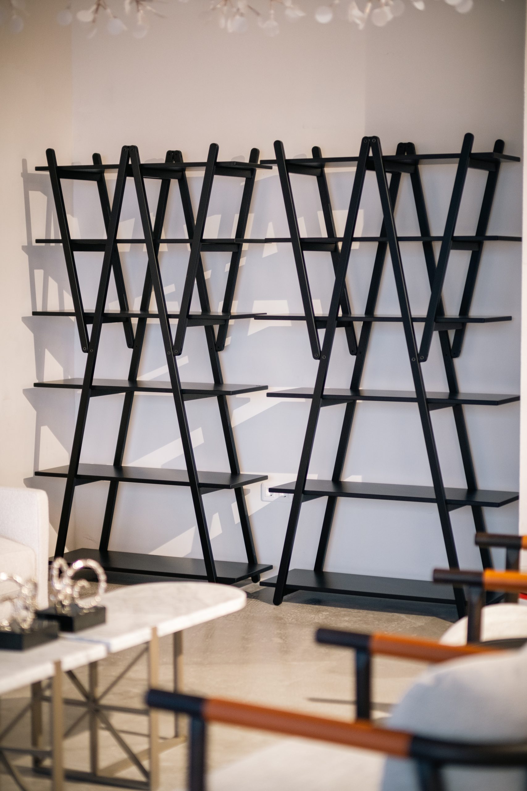 Realizată integral din lemn masiv de fag, biblioteca se remarcă prin finisajul său rafinat Lacquered Black Beechwood – un negru mat elegant care scoate în evidență forma geometrică și structura ingenioasă.
