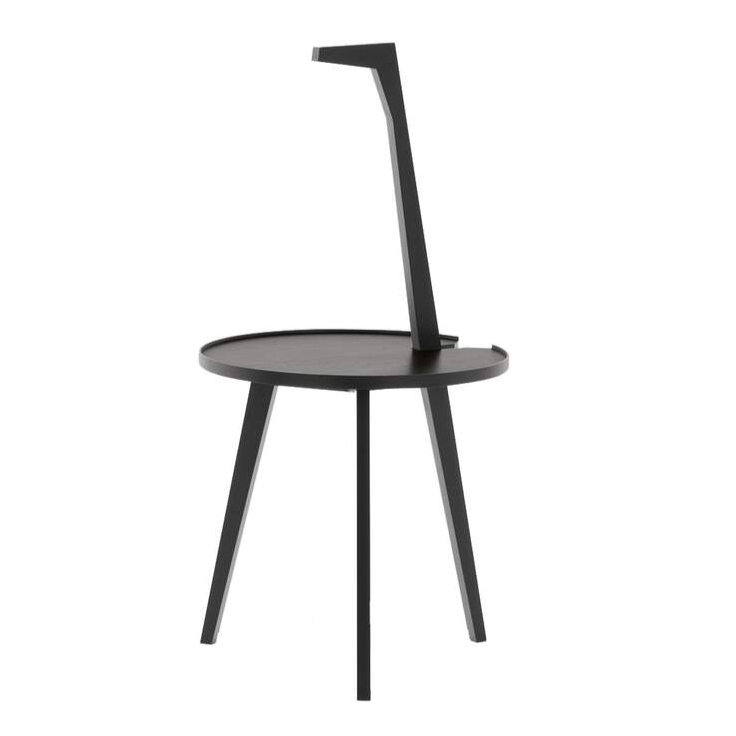 Designul este definit de blatul rotund cu margine usor reliefata, care aminteste de o tava, si de cele trei picioare subtiri, atent proportionate pentru stabilitate si aspect aerisit. Un detaliu distinctiv este piciorul prelungit, care functioneaza ca maner discret si permite mutarea usoara a masutei acolo unde ai nevoie de ea.