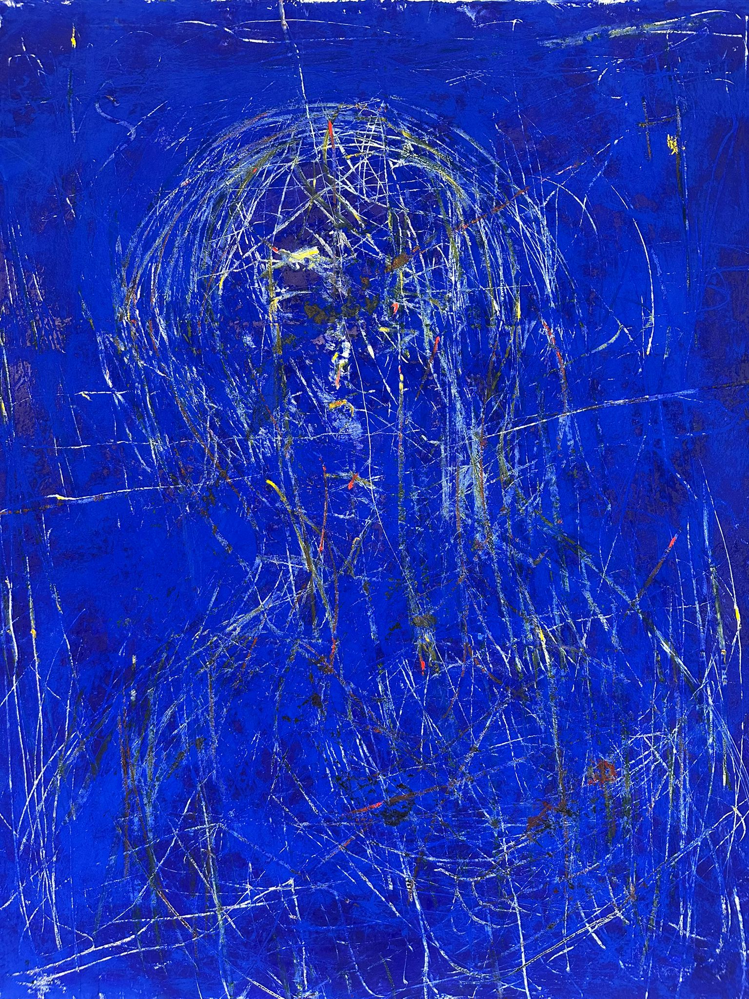 Lucrarea „Identitate” se construiește în jurul unei meditații plastice asupra prezenței și a transcendenței. Dominanta albastrului – intensă, copleșitoare, aproape imaterială – devine un câmp al interiorității, în care privitorul este invitat să contemple esența existenței. Gestul pictural, stratificat și spontan, înscrie pe suprafața pânzei urmele unei căutări, ale unei tensiuni între vizibil și invizibil. În adâncul culorii, lumina se manifestă subtil, ca o energie revelatoare, conturând o „amprentă a ființei” – un spațiu în care materia și spiritul se ating.