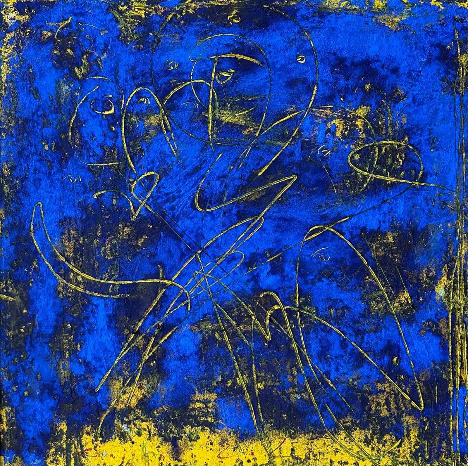 Lucrarea „Urme de aripi” explorează ideea de mișcare și transcendere, surprinsă în tensiunea dintre material și imaterial. Culoarea albastră, profundă și spirituală, se întâlnește cu accentele de auriu într-un dialog al luminii și al ascensiunii. Liniile gravate, asemănătoare unor gesturi de zbor, evocă trecerea ființei prin spațiu, o căutare a echilibrului dintre pământesc și divin. În această compoziție, urmele devin simboluri ale libertății interioare, amintiri ale zborului sufletului către lumină.